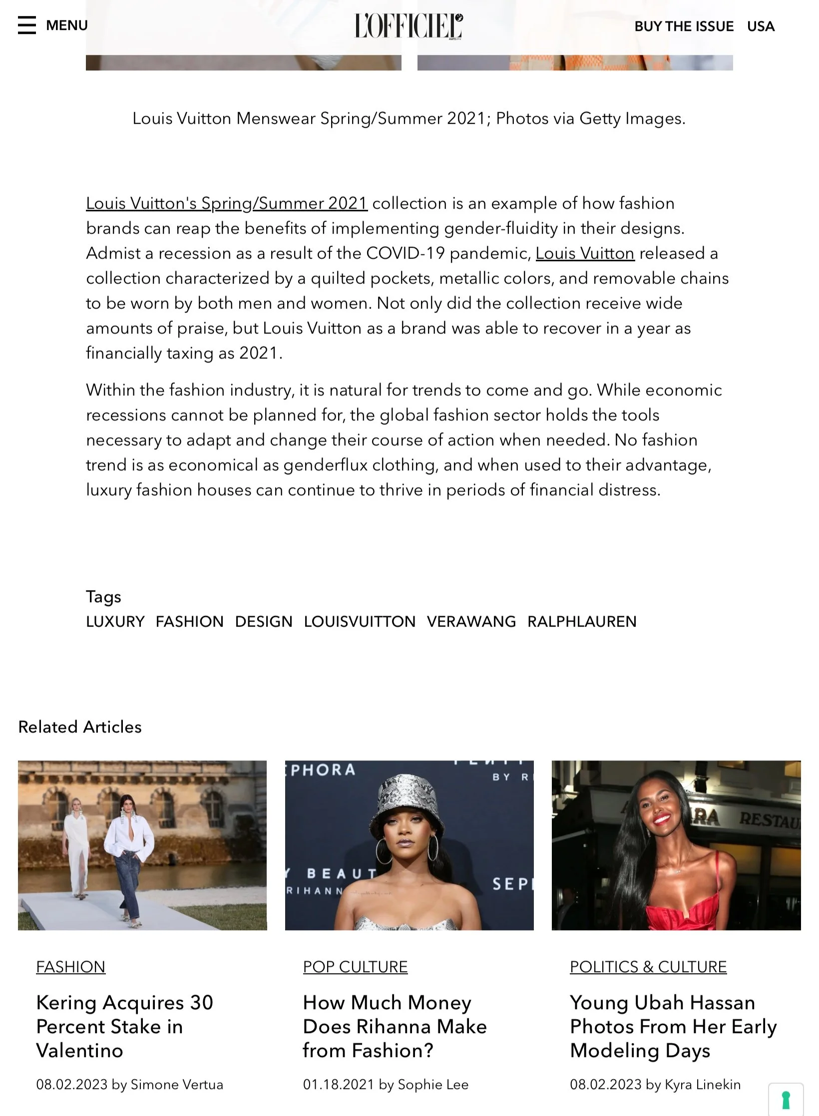 My role as Editorial Intern at French fashion magazine L’Officiel USA required an attention to detail, creative storytelling, and the ability to curate brand-specific content on tight deadlines. From transcribing celebrity interviews to publishing time-sensitive features, I developed a sharp eye for tailoring content for a digital audience. In addition, I was responsible for the maintenance, organization, and updating of the L’Officiel USA digital archive, ensuring each published piece was accurately labeled, stored, and easily accessible at a moment’s notice.